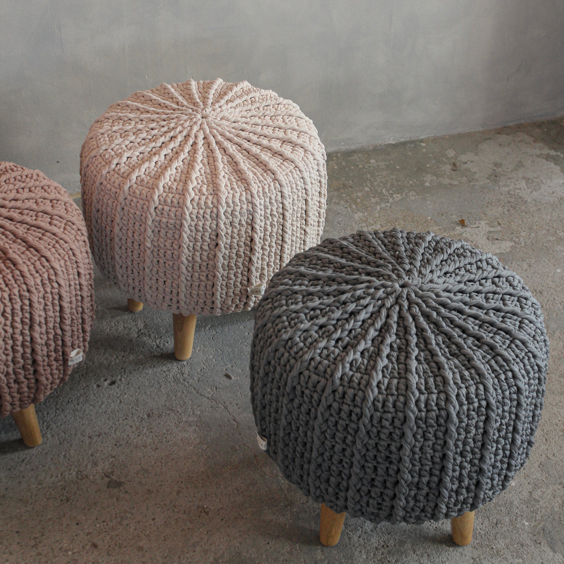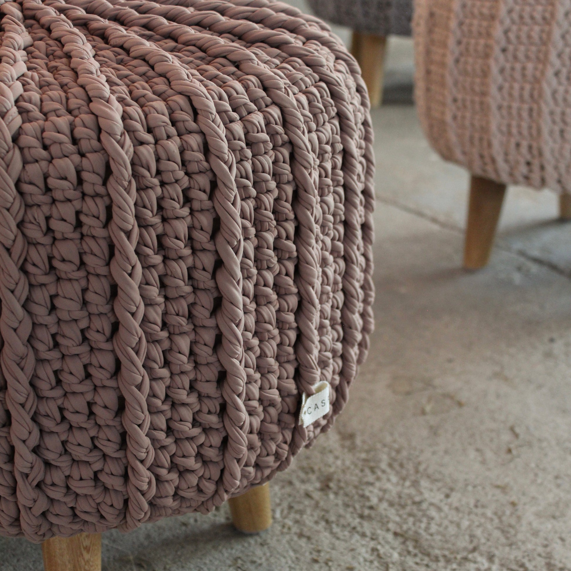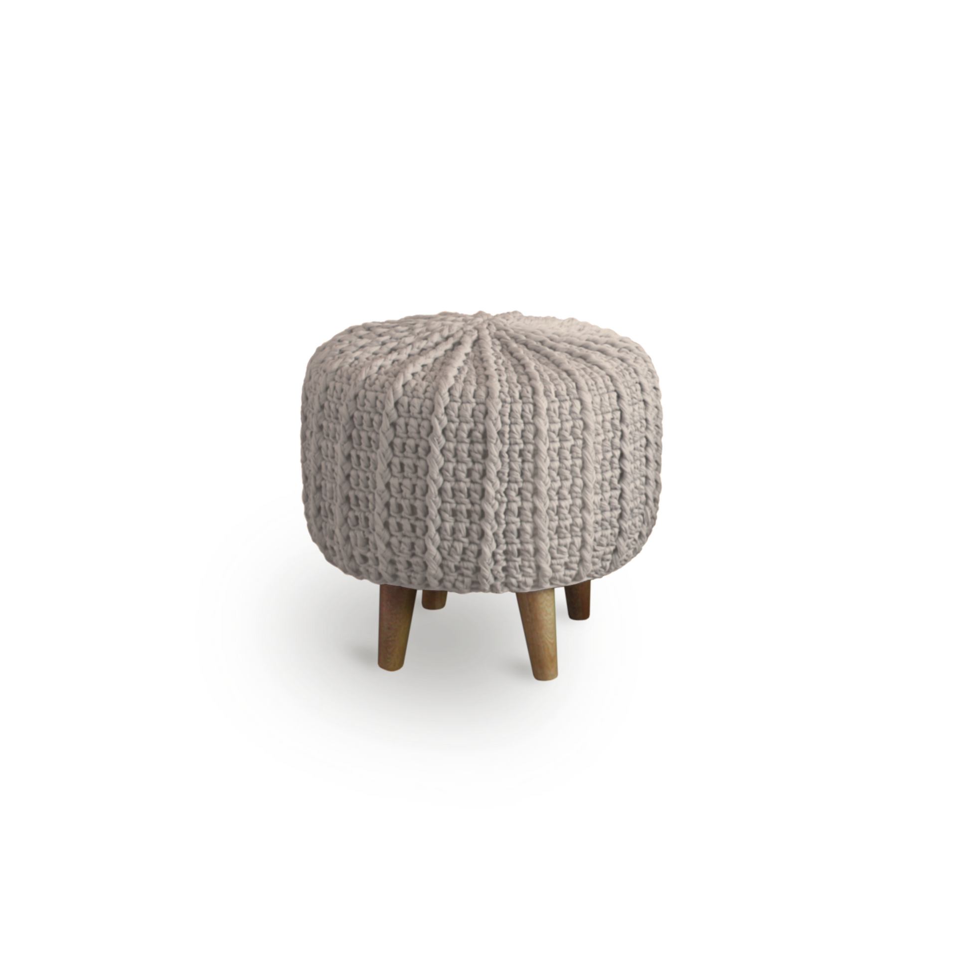 Nuestro Butaco bucle cuenta con una funda removible tejida a crochet con fibras textiles recuperadas. Sus 4 patas torneadas están hechas en madera flor morado y acabado mate.