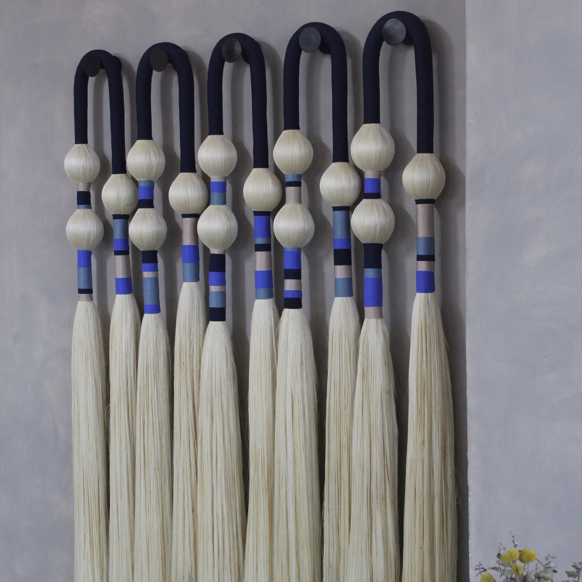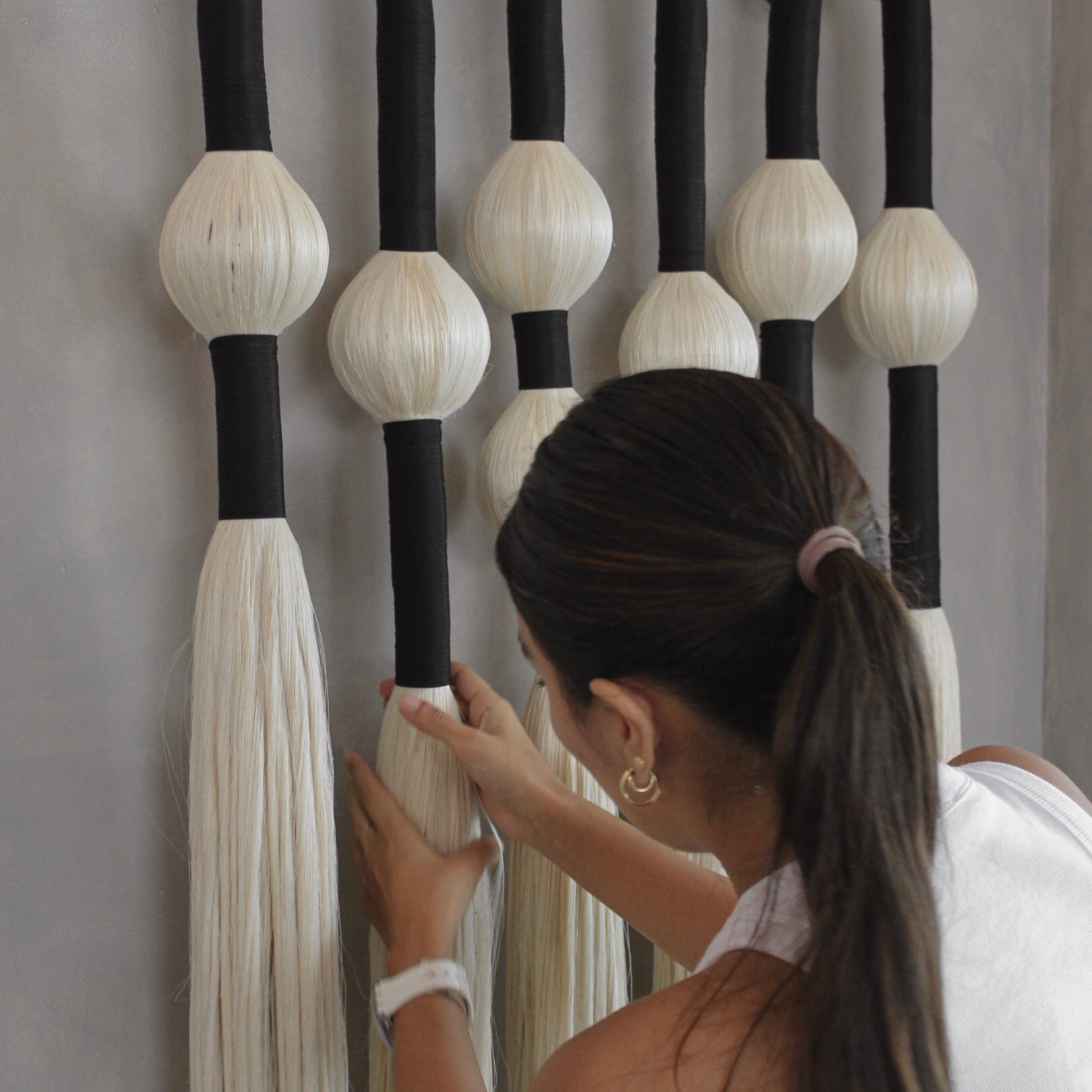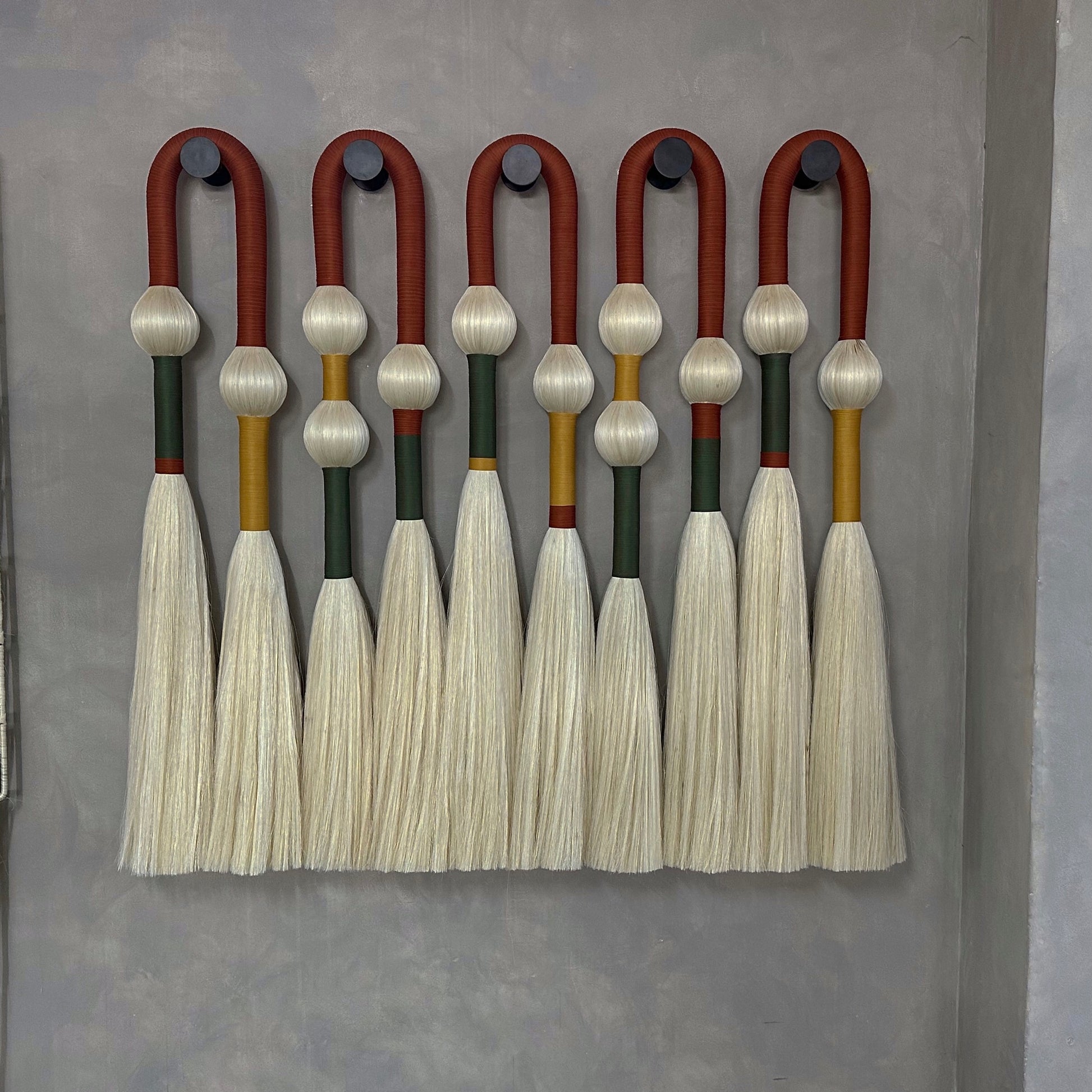 Nuestra curva de fique es una pieza decorativa de pared hecha en fique en rama y tejida con fibras textiles recuperadas bajo la técnica de embarrilado. Cada una de estas piezas incluye su soporte para colgar hecho en lámina y varilla de acero, terminado con pintura electrostática.