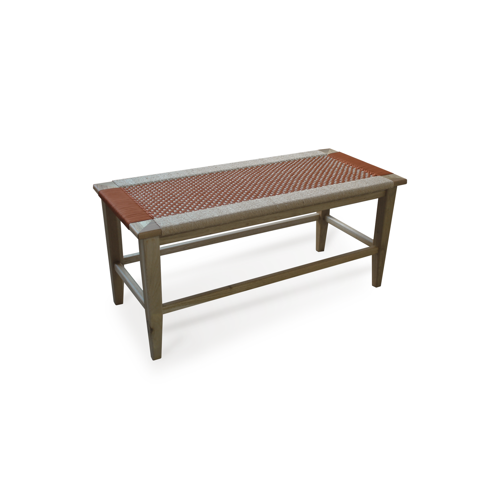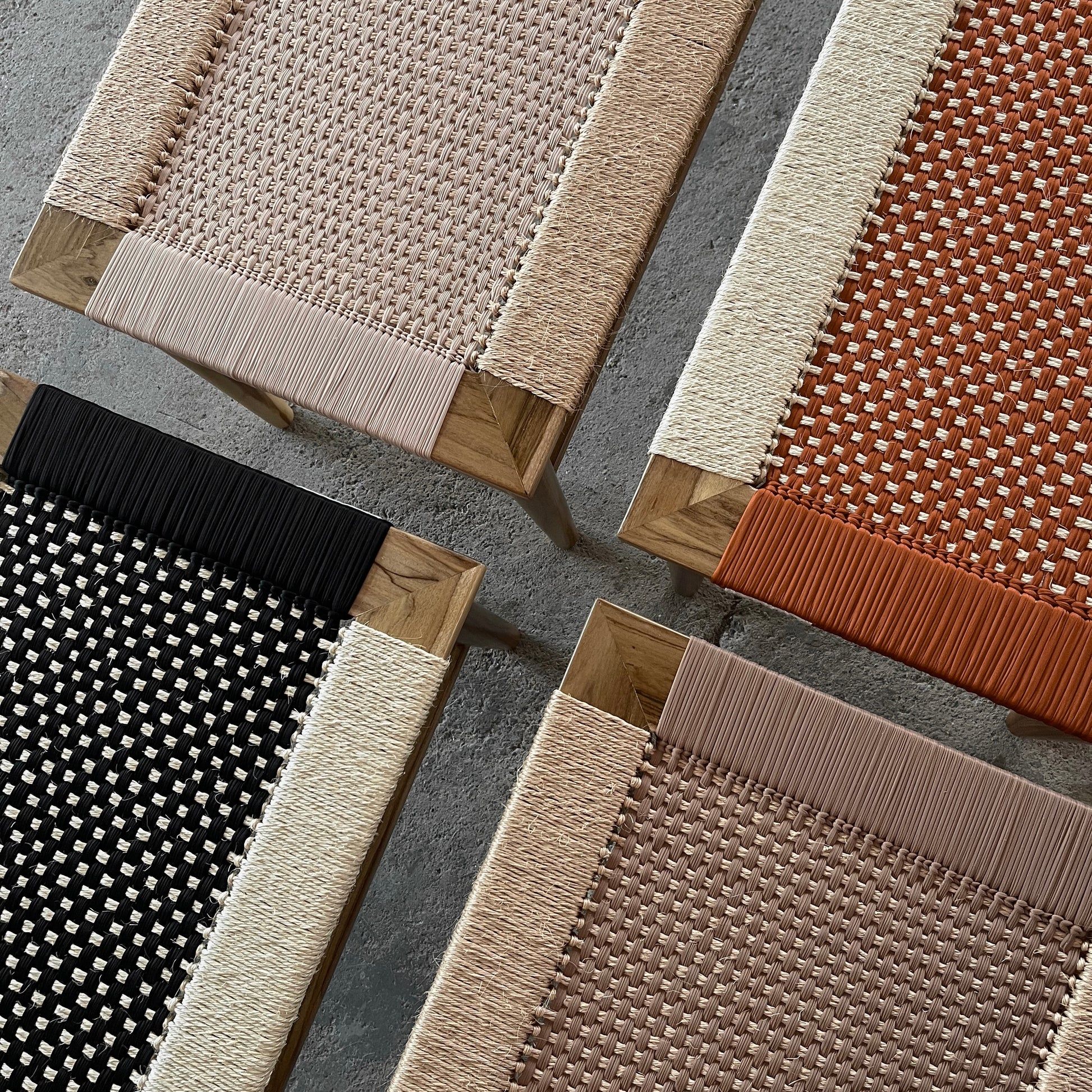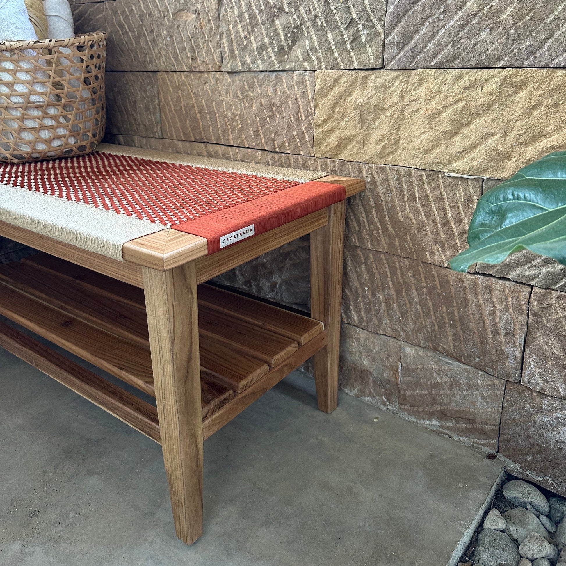 Nuestro Piecero Curití está tejido con fibras textiles recuperadas y fique trenzado bajo la técnica trama crochet. Su estructura está hecha en madera móncoro maciza y acabado mate.
