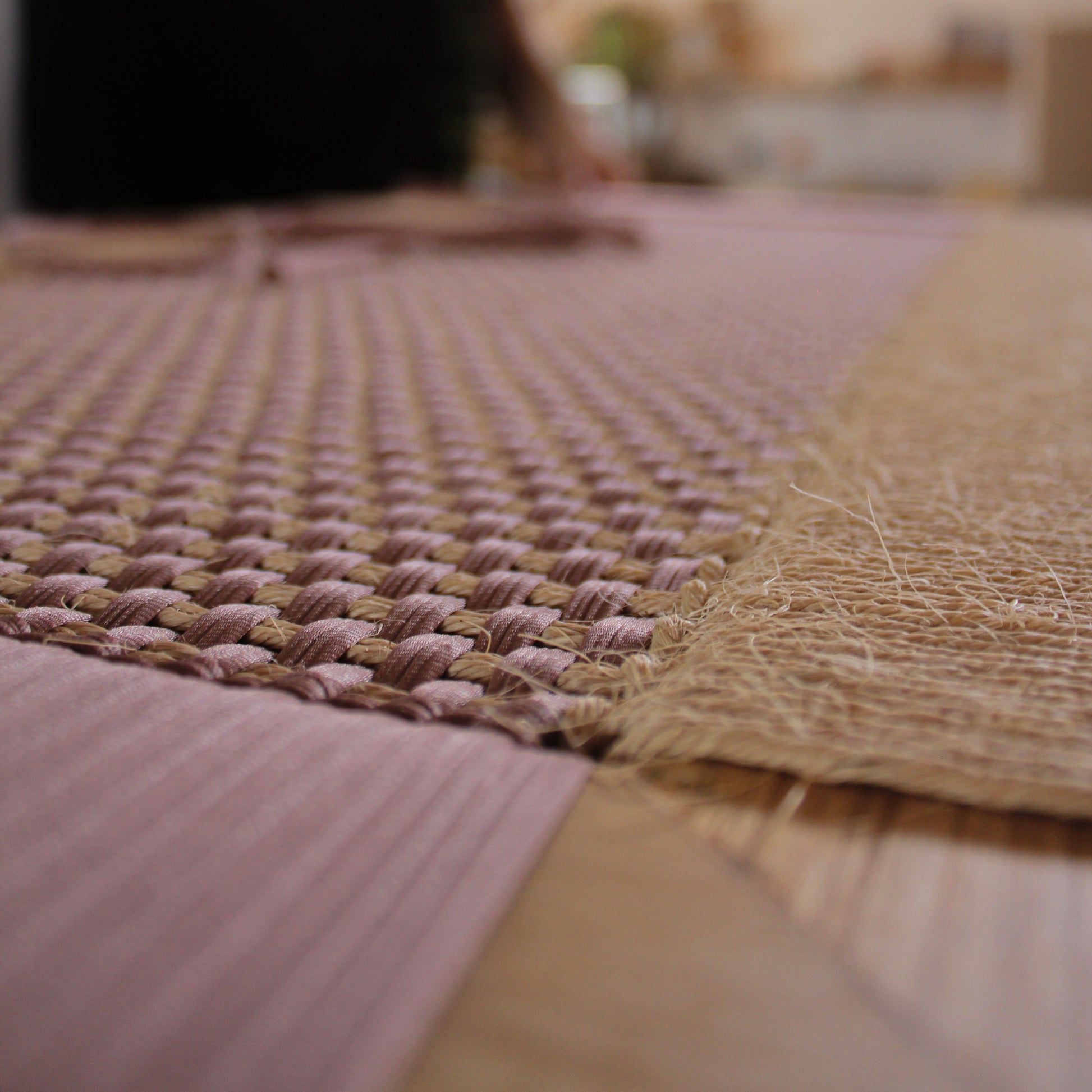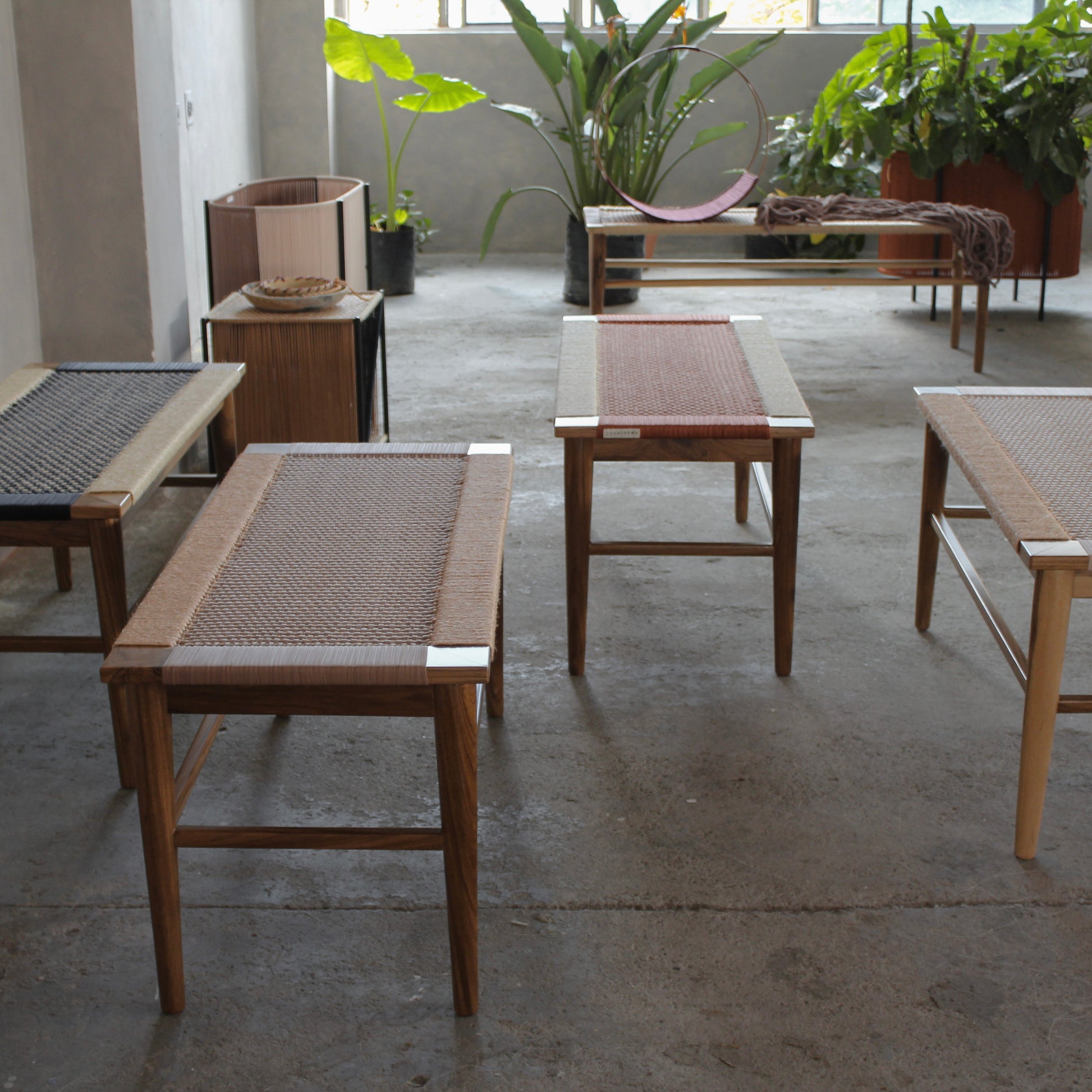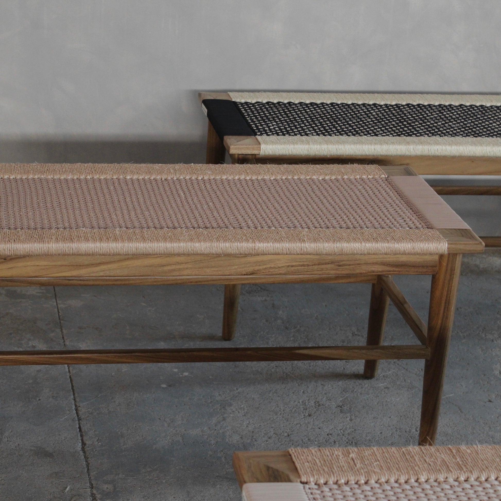 Nuestro Piecero Curití está tejido con fibras textiles recuperadas y fique trenzado bajo la técnica trama crochet. Su estructura está hecha en madera móncoro maciza y acabado mate.