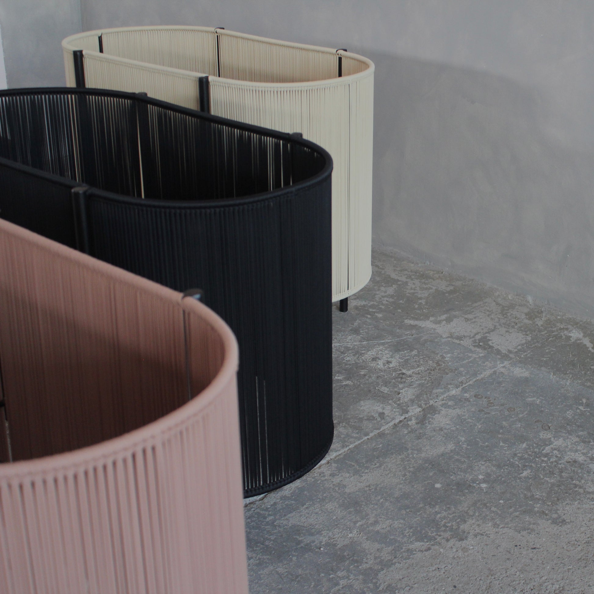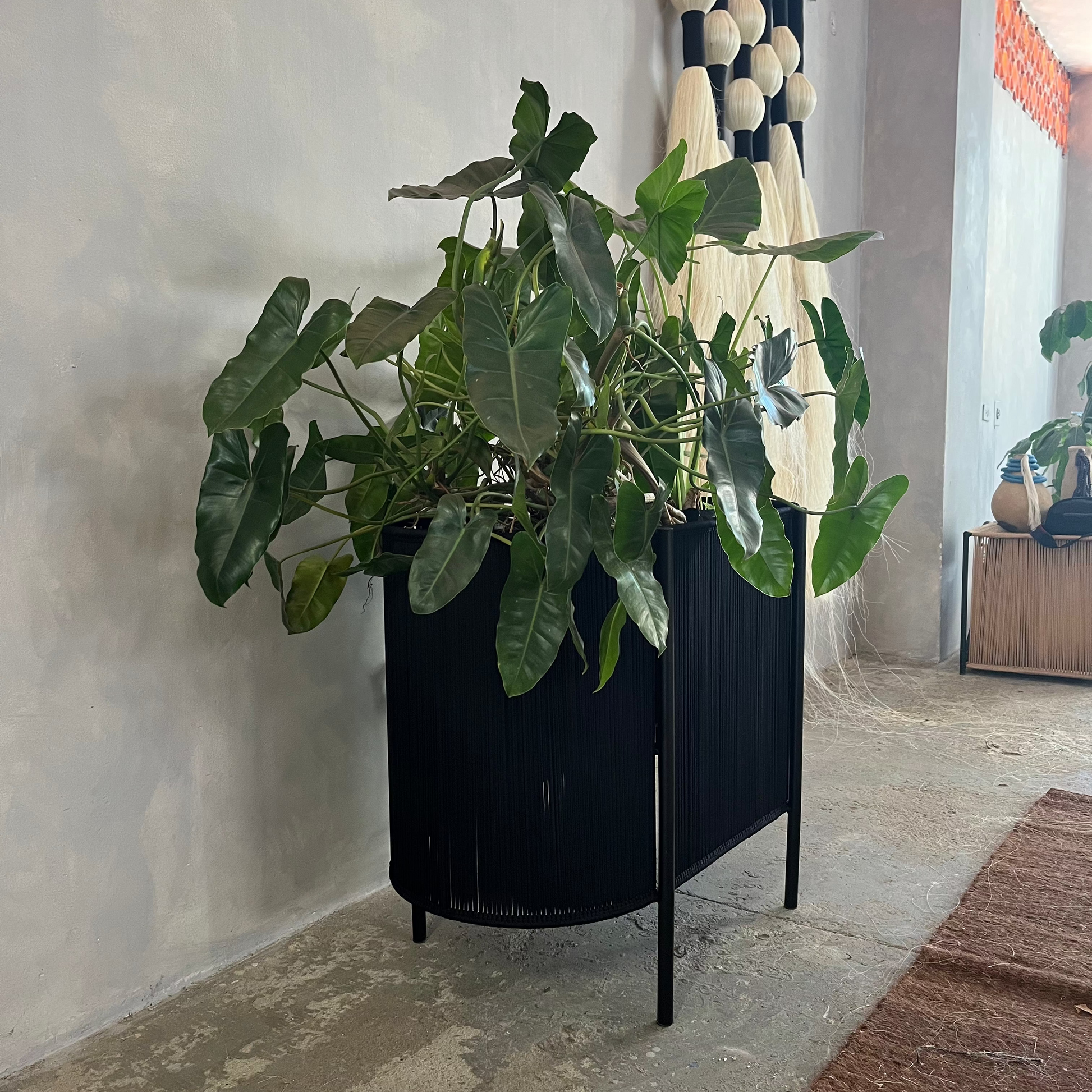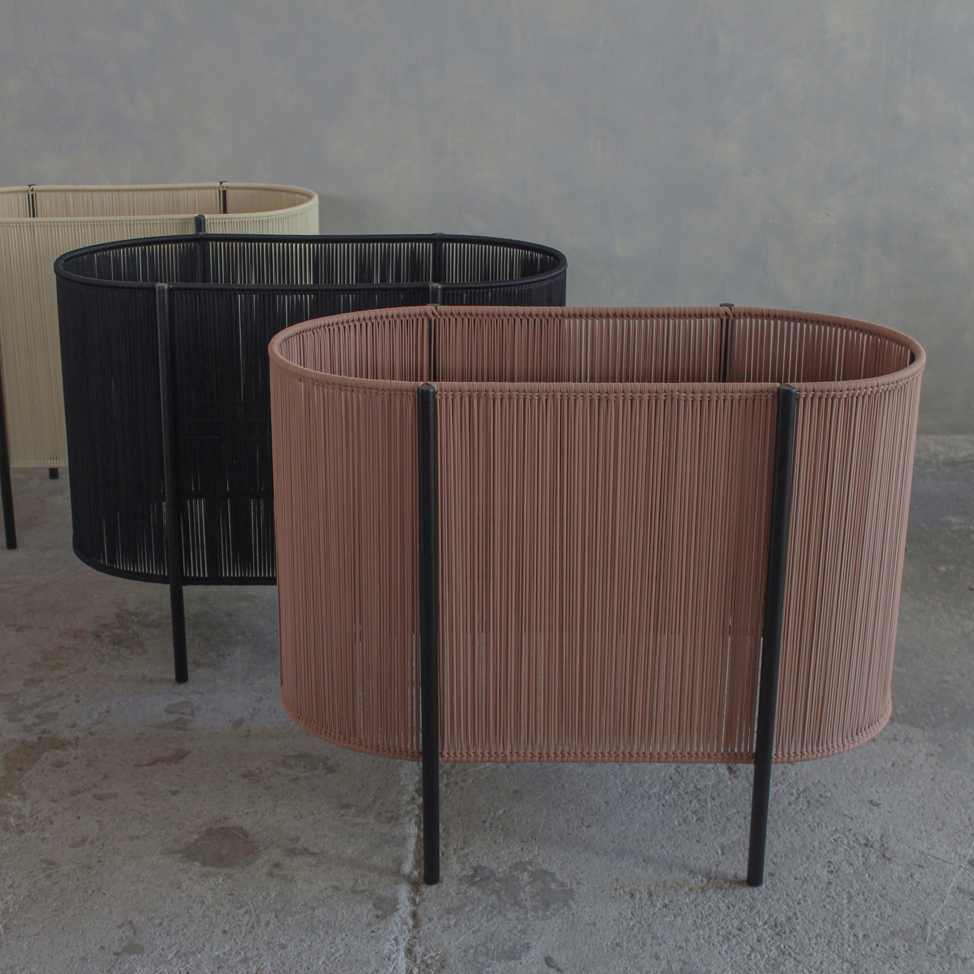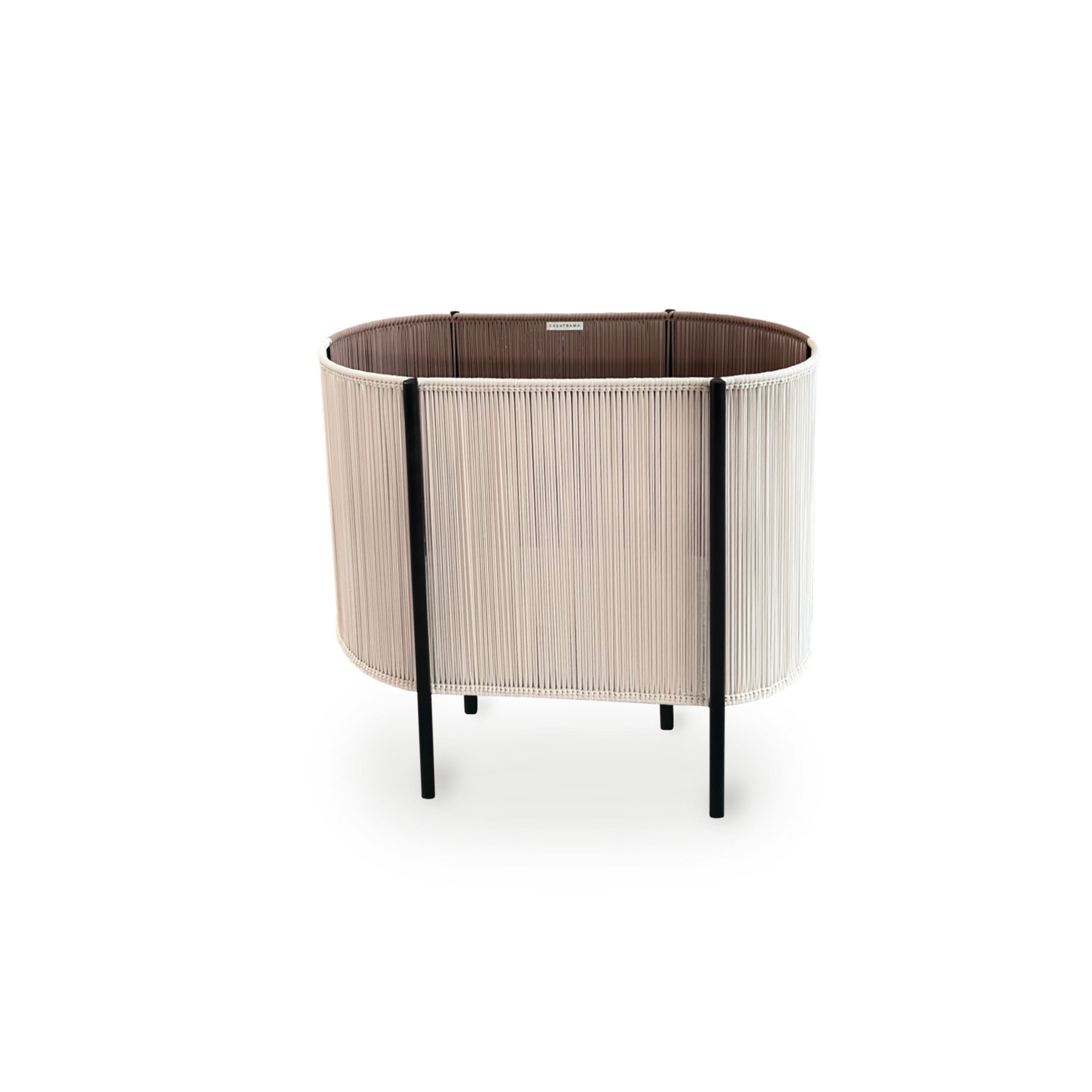 Nuestra Matera conga oval está tejida con fibras textiles recuperadas bajo la técnica trama crochet. Su estructura hecha en varilla y tubo de acero, terminaa con pintura electrostática.