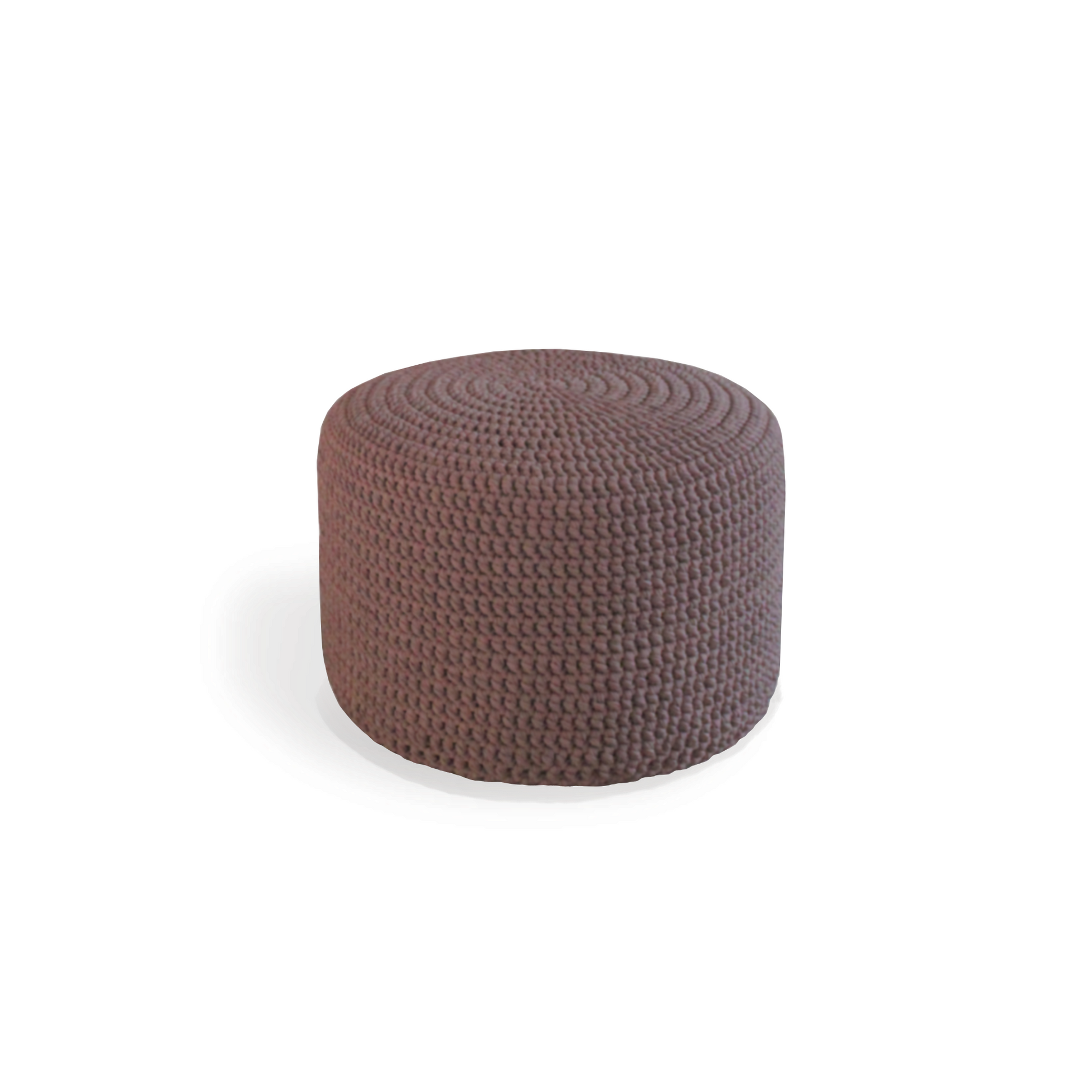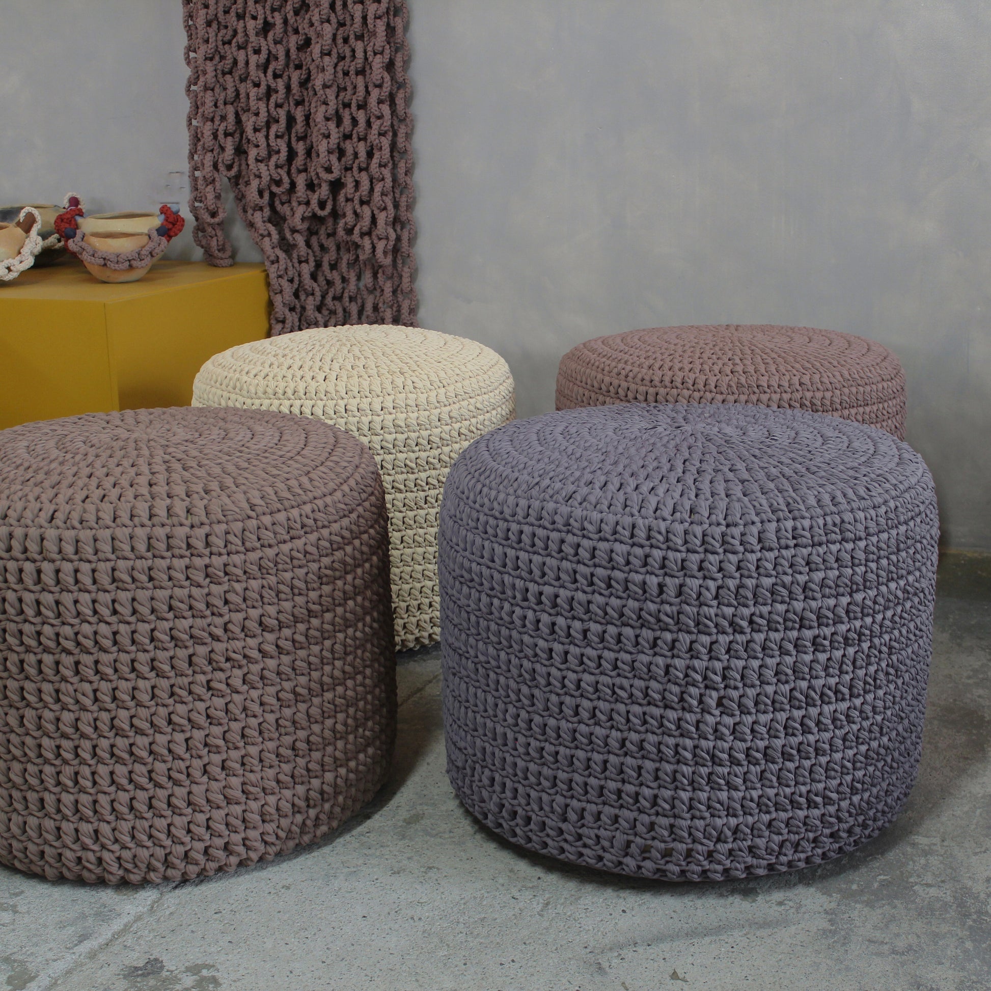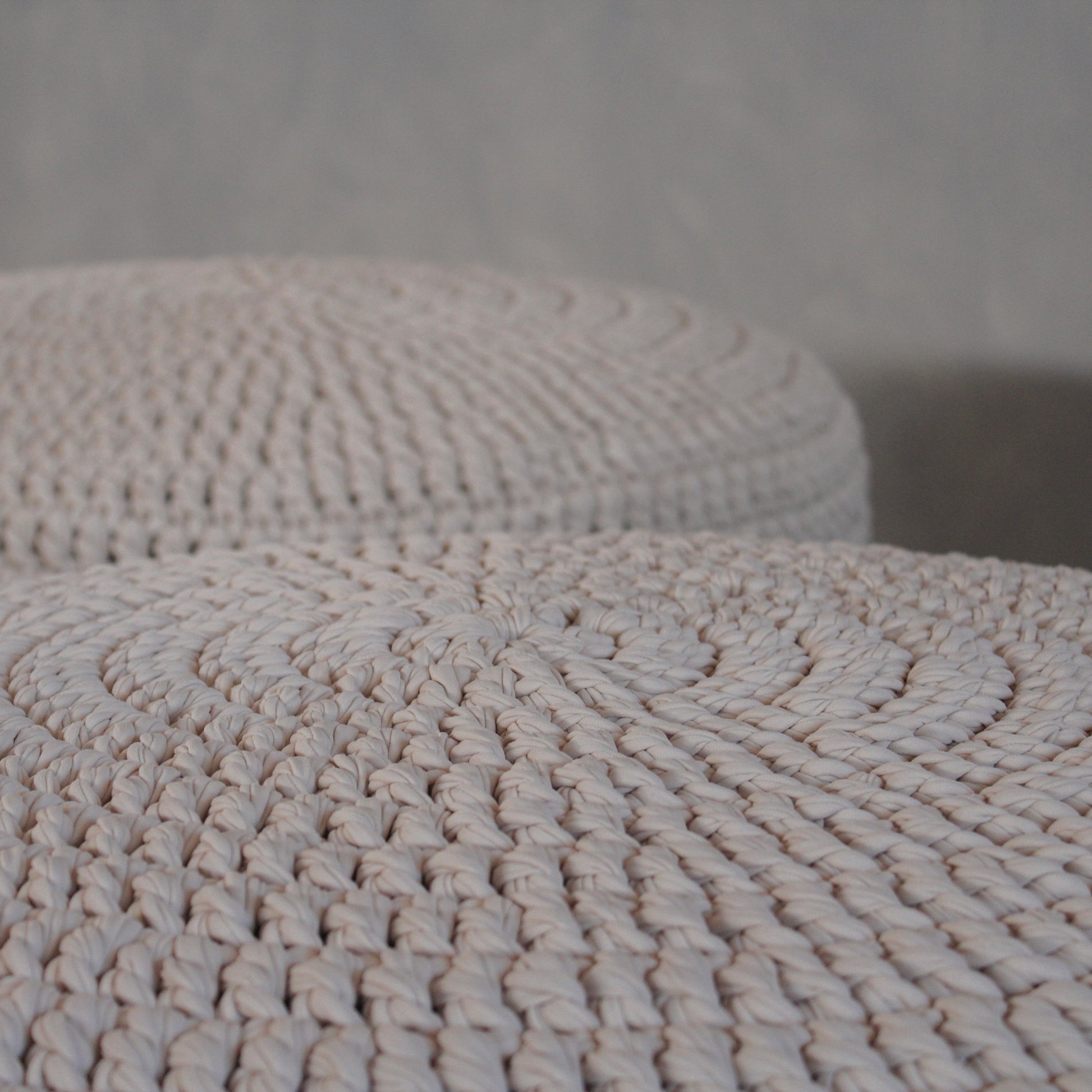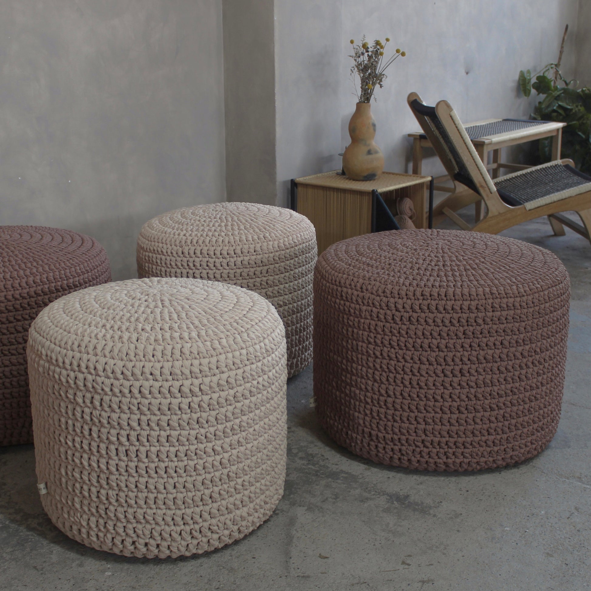 Nuestro Puff espiral cuenta con una funda removible tejida a crochet con fibras textiles recuperadas.