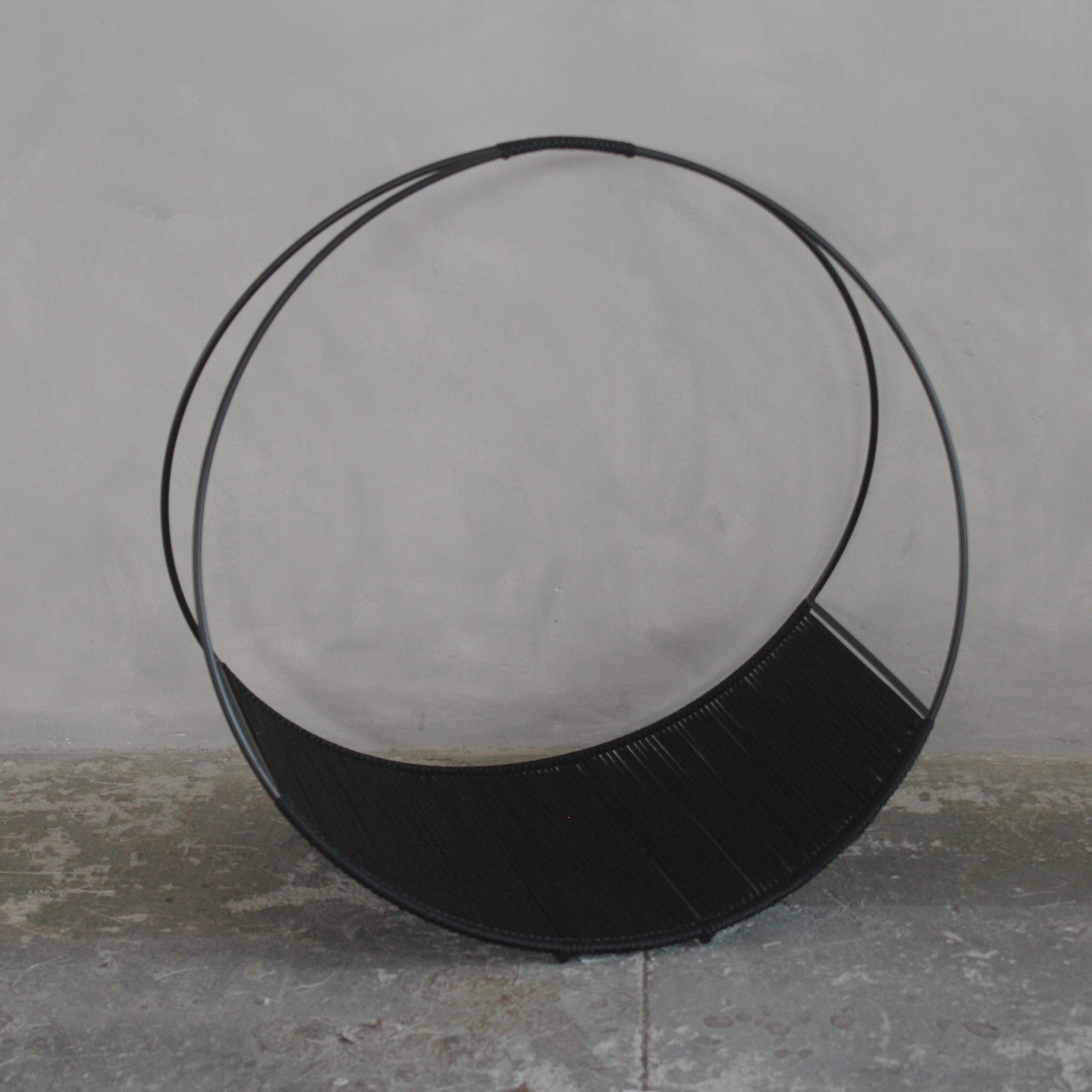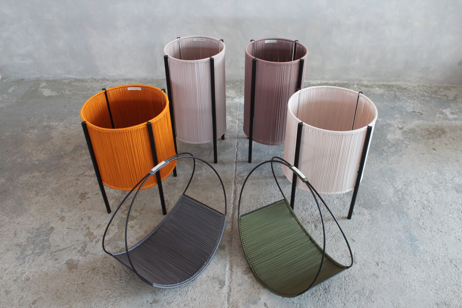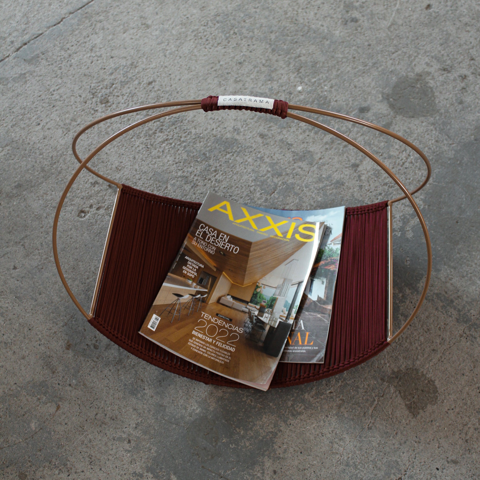 Nuestro Revistero está tejido con fibras textiles recuperadas bajo las técnicas trama crochet y macramé. Su estructura está hecha en varilla de acero y terminada con pintura electrostática.