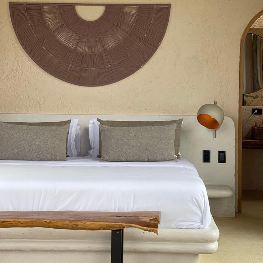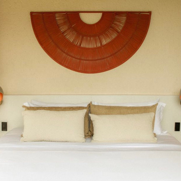 Nuestro tapíz abanico es una pieza decorativa de pared tejido con fibras textiles recuperadas bajo la técnica trama crochet. Su estructura está hecha en varilla y tubo de acero, terminada con pintura electrostática.